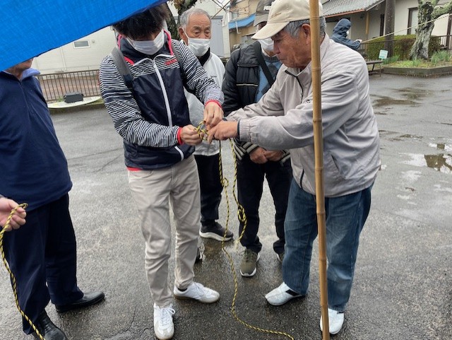 また小粥康正さんに避難時の日陰作り、雨除けをブルーシートとロープで実際に張っていただき、特にロープの各種結び方を伝授していただきました。